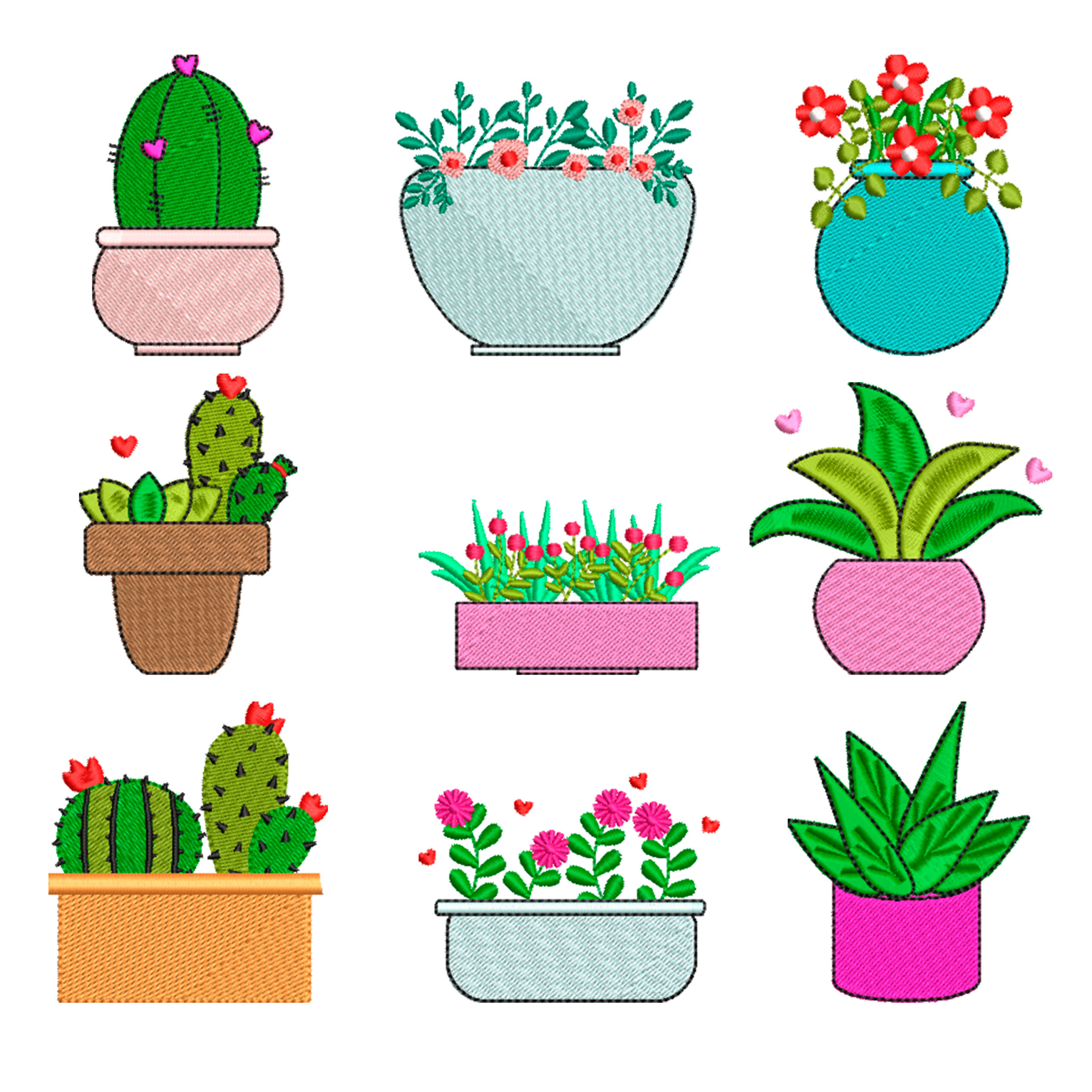 Este pack completo incluye 9 diseños únicos de cactus, flores y plantas, cada uno en dos tamaños diferentes.