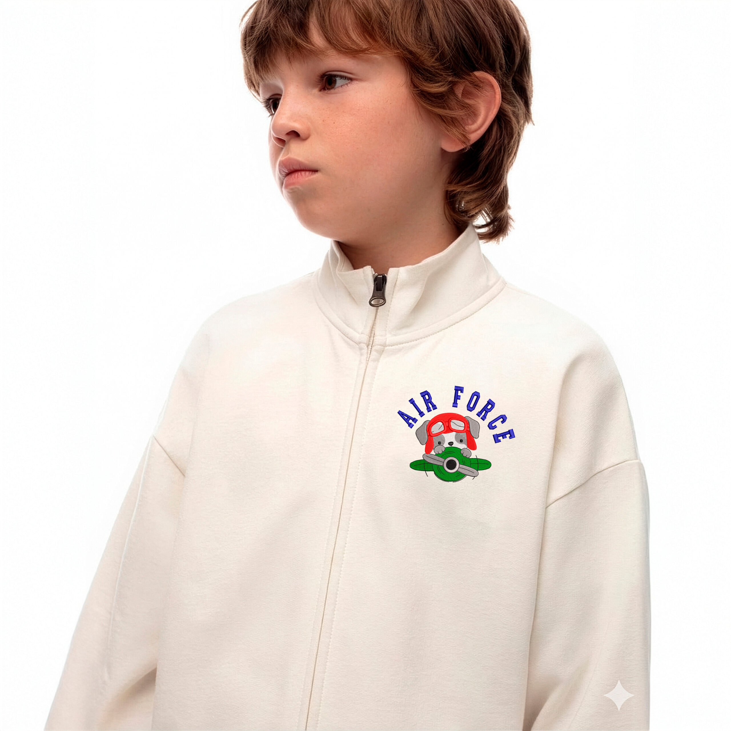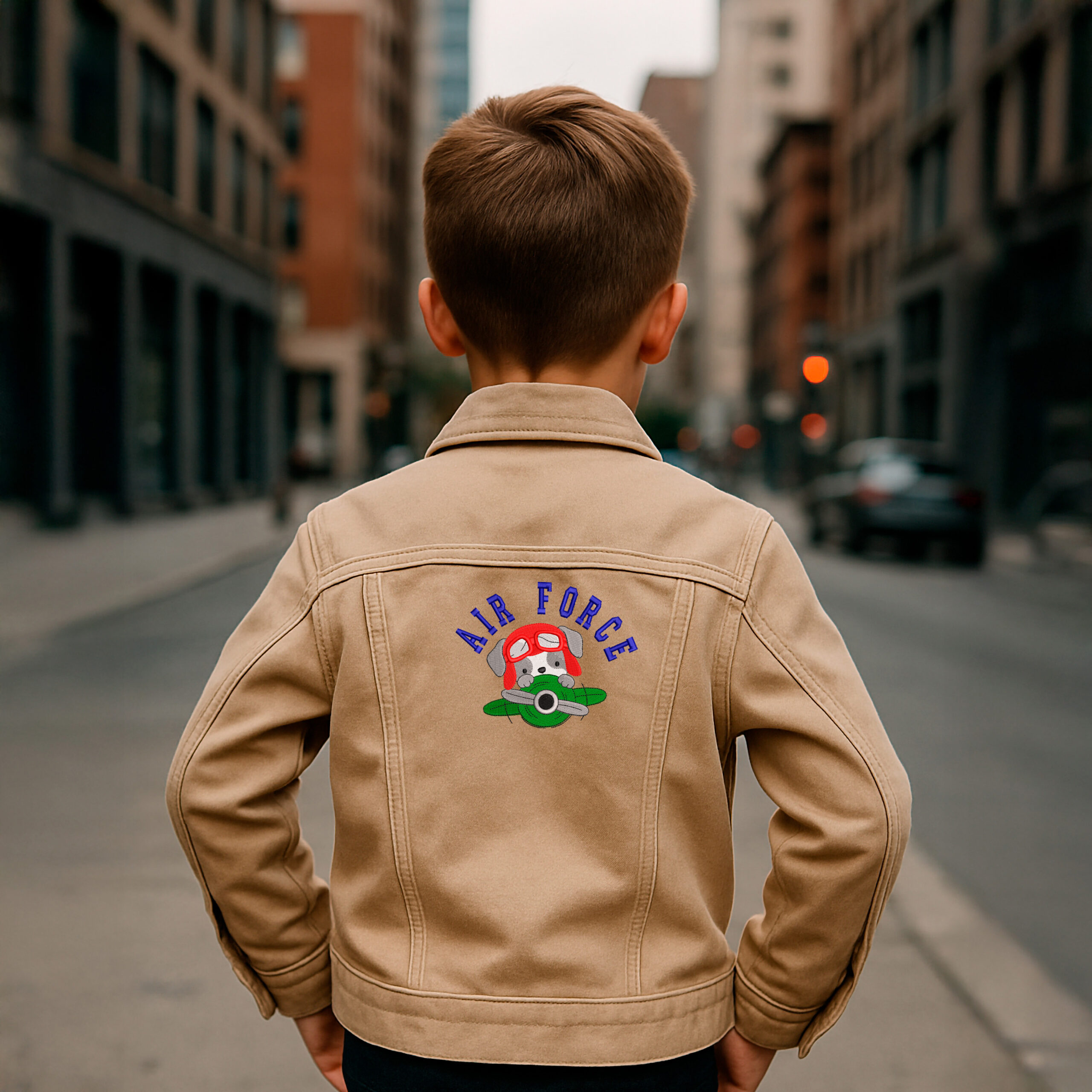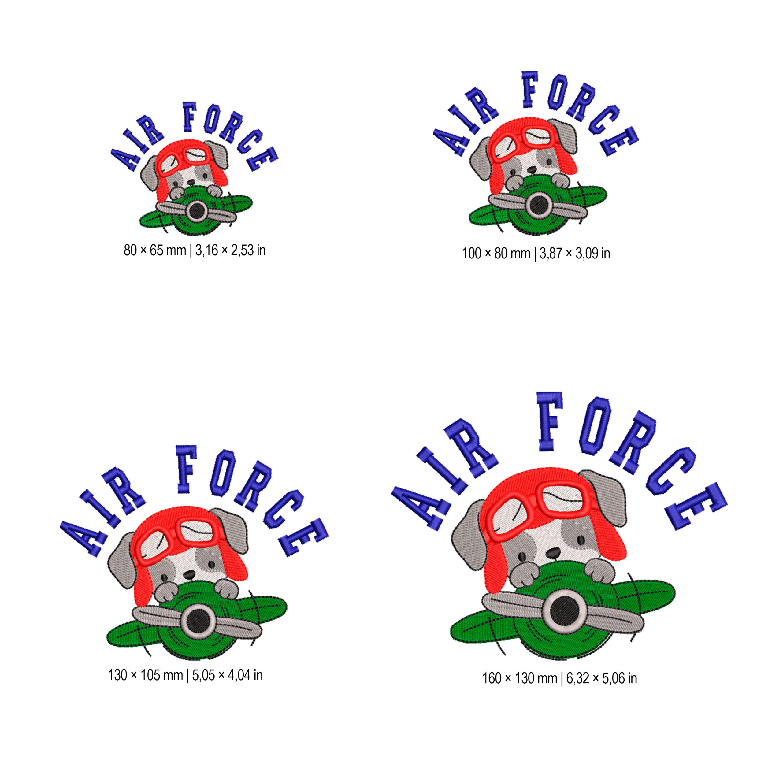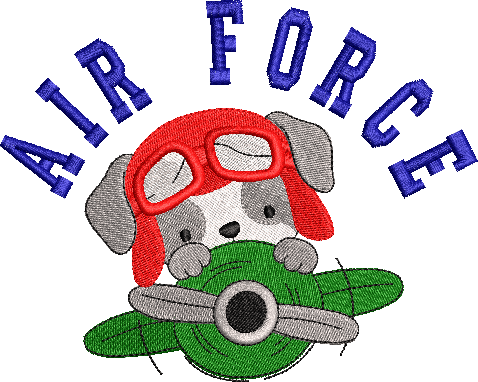 Perrito aviador asomando desde una avioneta con el texto “AIR FORCE” en arco. Preparado para bordar con buena definición y lectura.