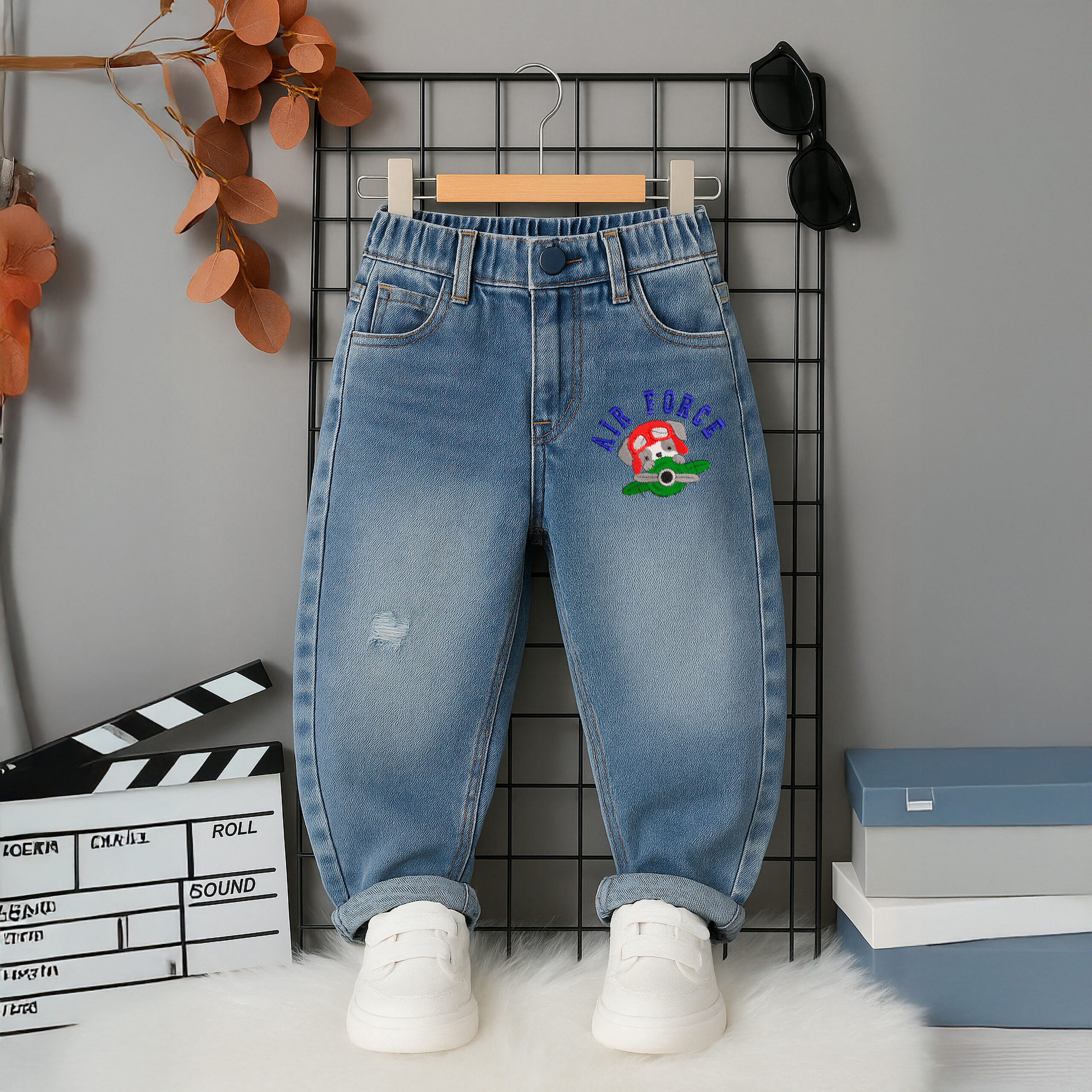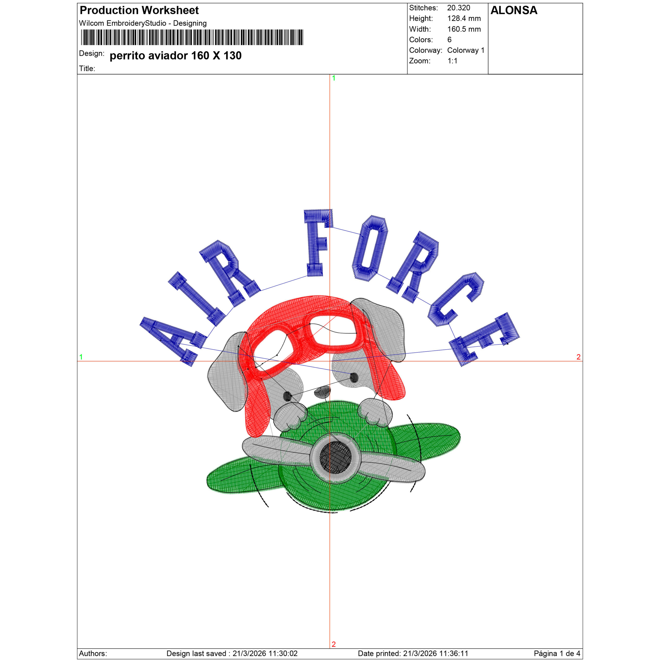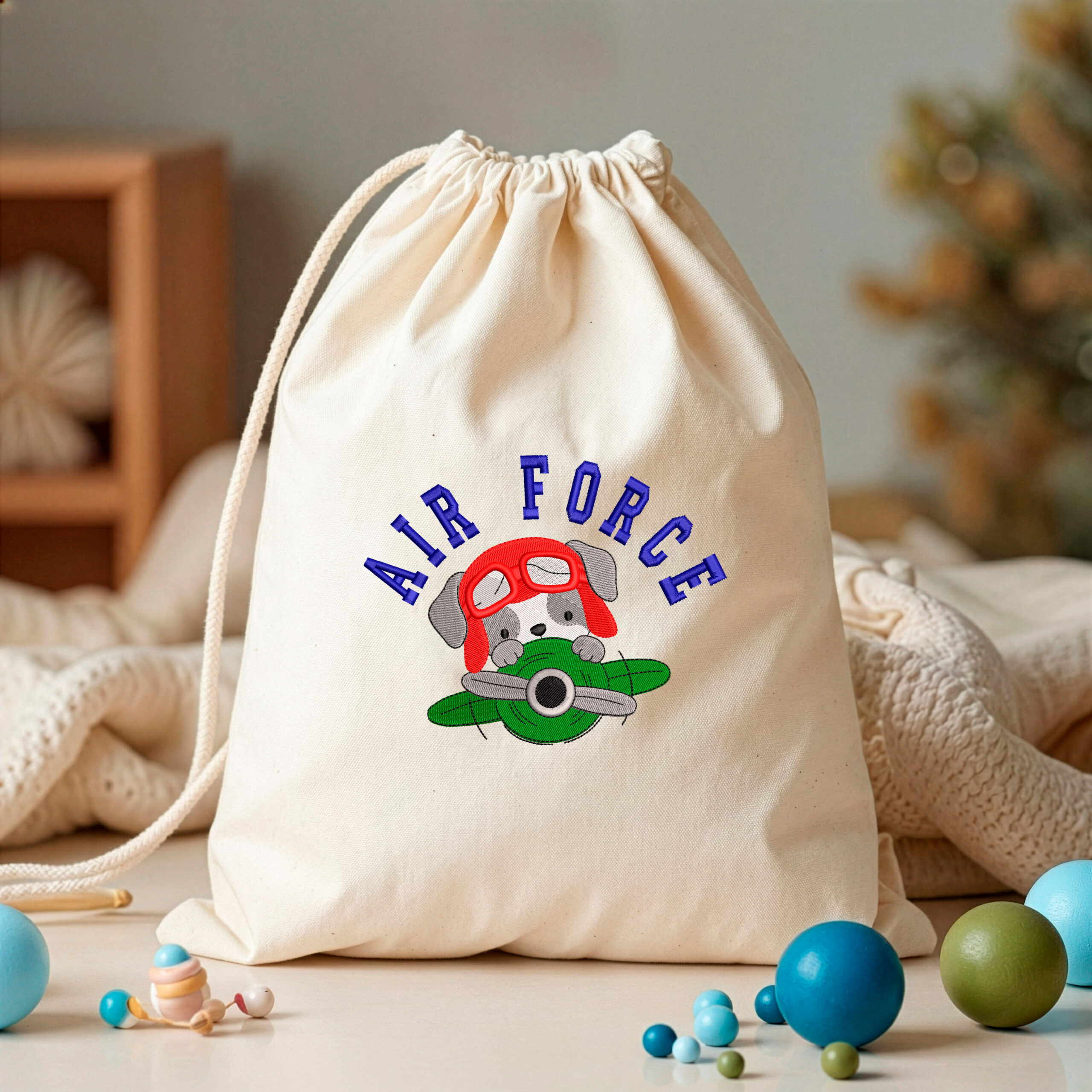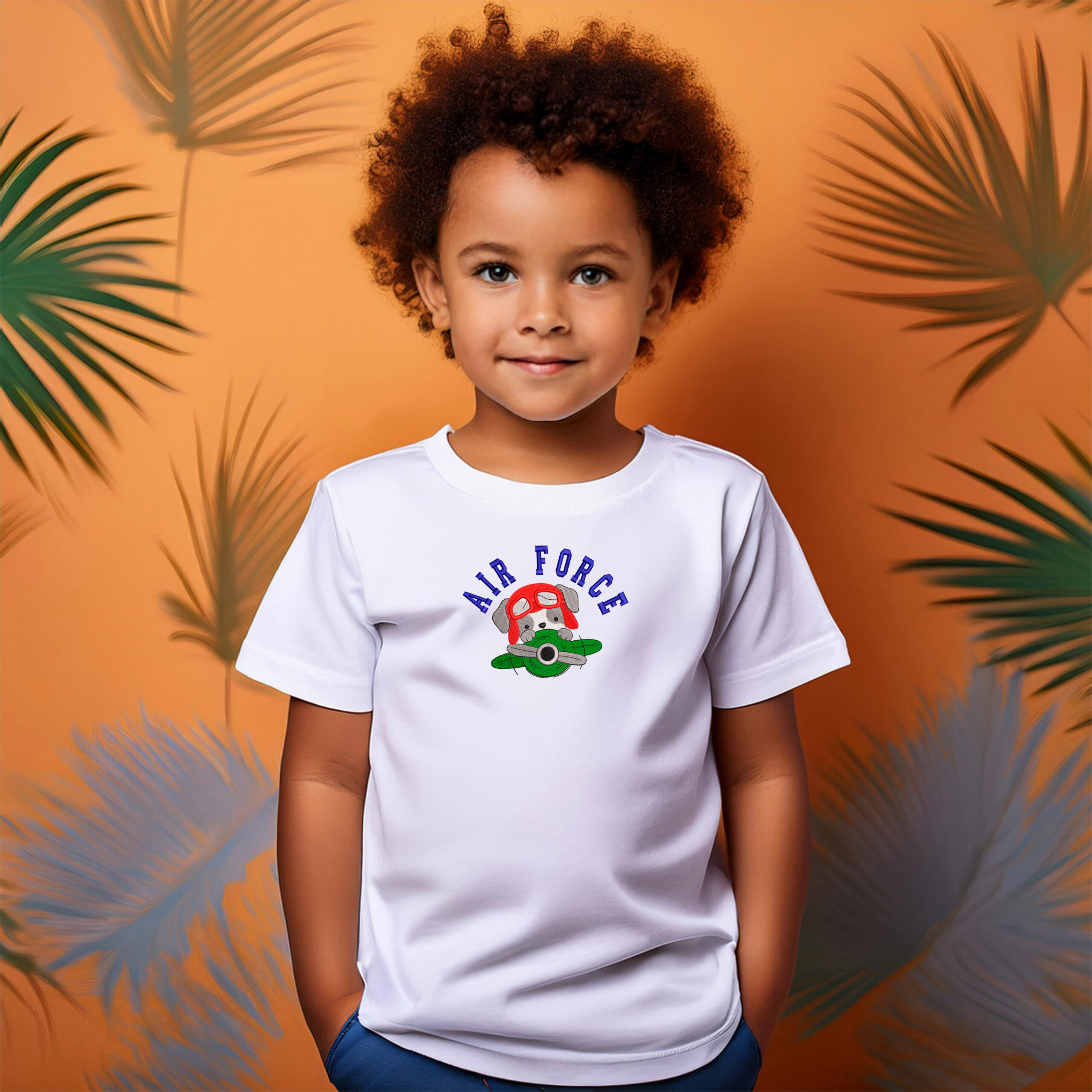 Perrito aviador asomando desde una avioneta con el texto “AIR FORCE” en arco. Preparado para bordar con buena definición y lectura.